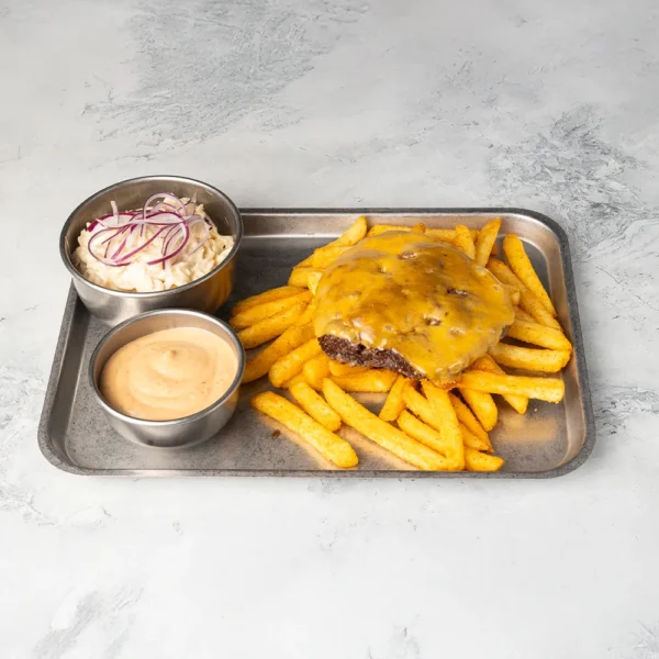 hasábburgonya, káposztasaláta, 15dkg marhahúspogácsa csíkok, cheddar sajt, választott szósz