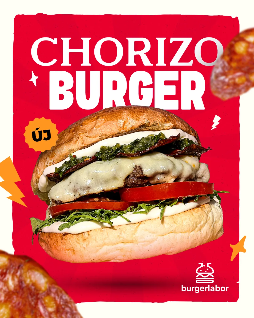 15dkg marhahúspogácsa, fokhagymás majonéz, rukkola, paradicsom, chimichurri, fehér cheddar sajt, grill chorizo