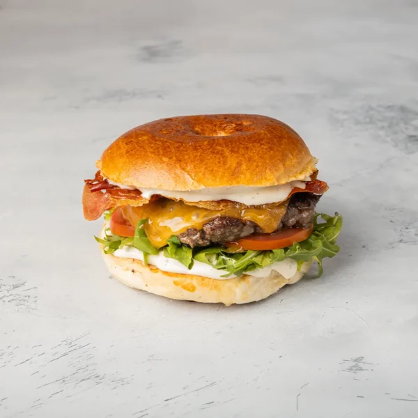 15dkg marhahúspogácsa, gorgonzolás majonéz, rukkola, paradicsom, házi lilahagymalekvár, grill prosciutto, cheddar sajt